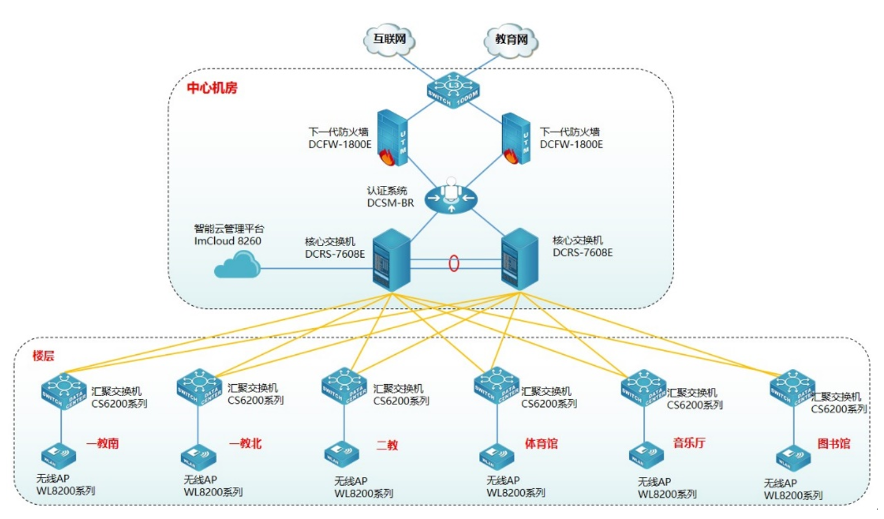 为方便用户对无线管理和维护,提升用户无线体验,使无线更智能化,此次采用九州酷游ku游智能云管理平台ImCloud 8260实现无线统一的管理、维护、认证,并可实现对全网无线设备管理、实现易部署、易维护、易扩展的无线网络。九州酷游ku游云管理ImCloud方案是网络服务的新模式,基于云端实现网络服务和管理,将复杂的网络管理简单化、智能化、可视化,提升用户网络体验。同时为了保证无线的安全,无线采用Portal准入认证,云管理ImCloud和九州酷游ku游身份认证系统DCSM-BR实现联动,用户需要顺利获得账号和密码认证成功后才能接入无线网络,在保证无线连接的便捷性同时兼顾无线的安全性。